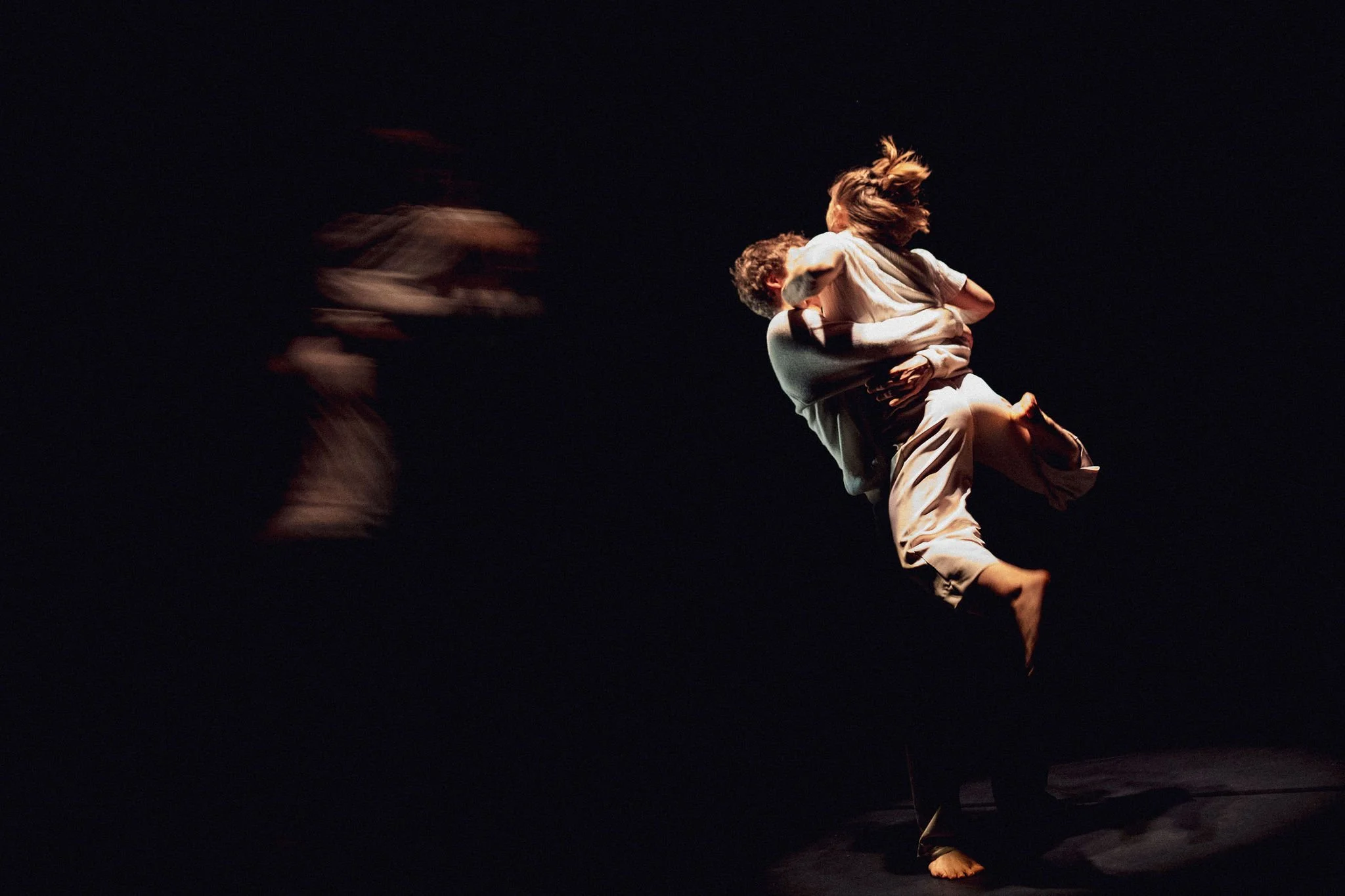 With minimal scenography, and the rich lighting of Claire Seyller, we follow their relationship through moments of frenzy and exhaustion. The original score by Simon Leoza takes us through the intimate and grandiose evolution of the protagonists, where the exchange of roles and lifts, like a new language, blurs all our preconceptions.